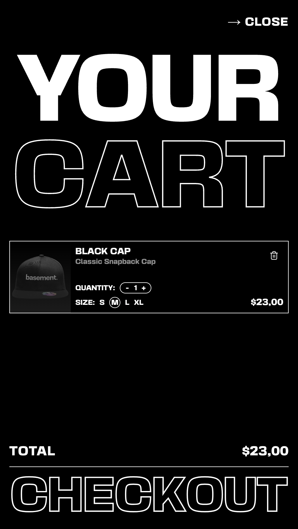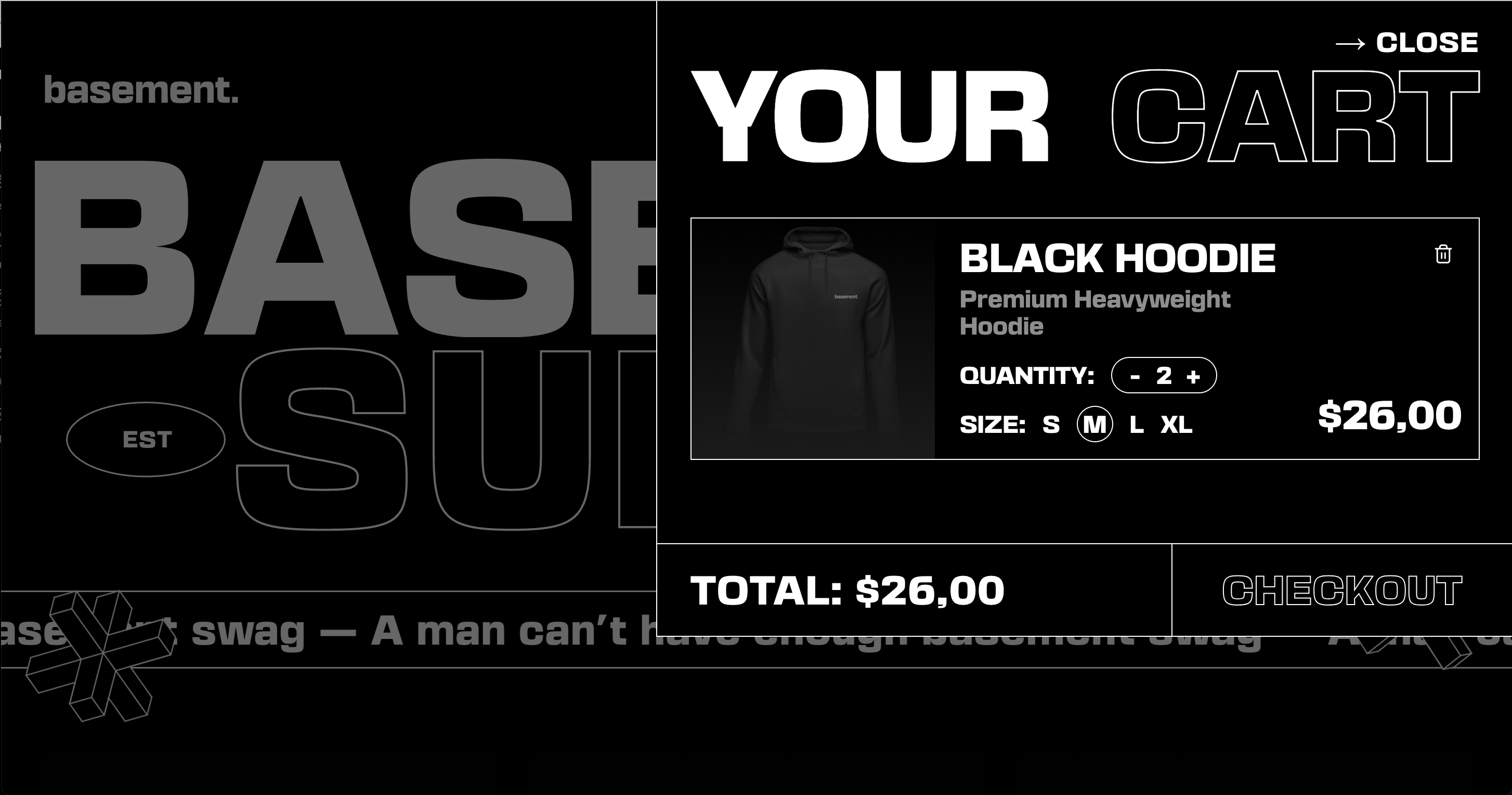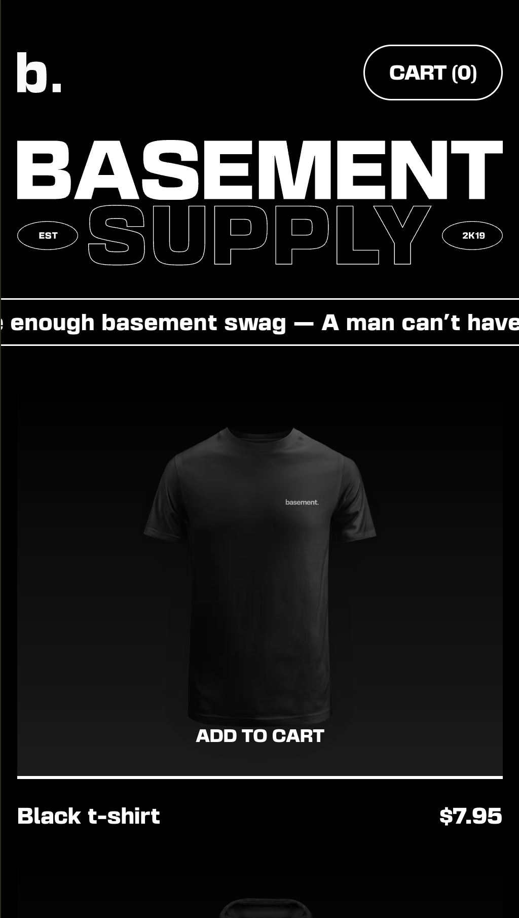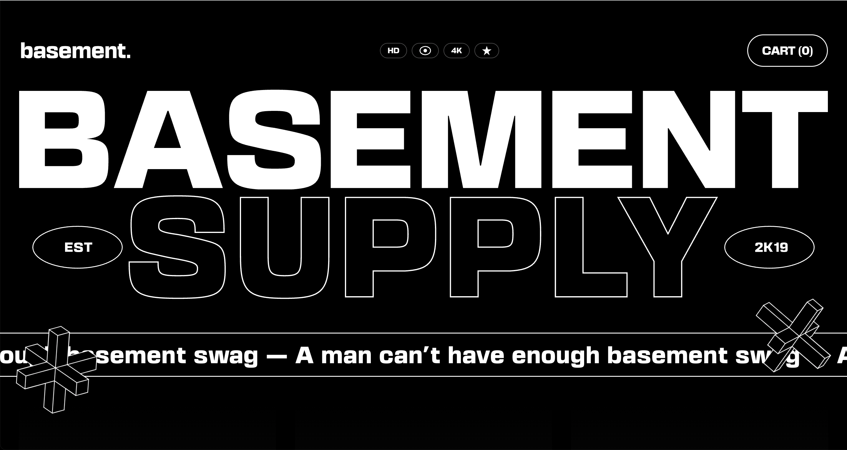 Main landing page with animated marquee text, product showcase, and the iconic Basement aesthetic.